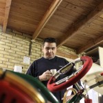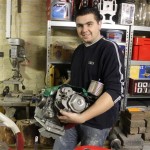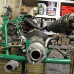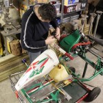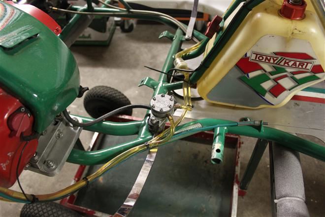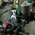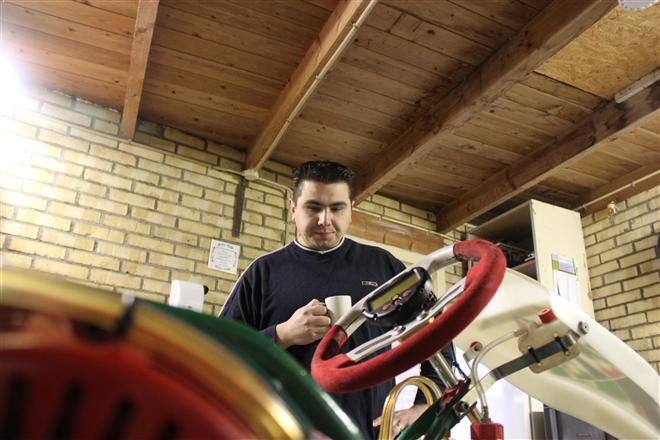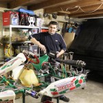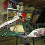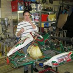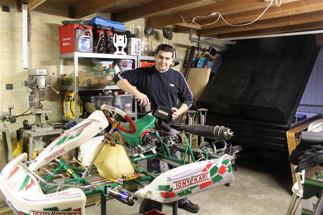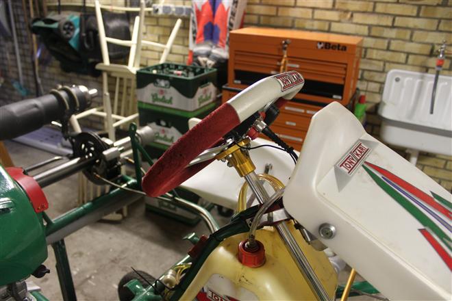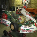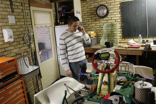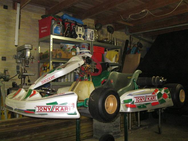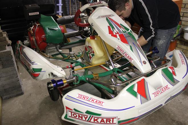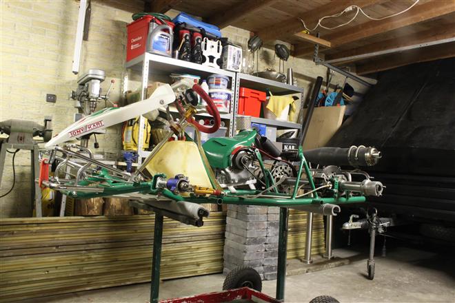 Foto 1 t/m 3: de Tony Kart met de Honda 390cc 4-takt uit seizoen 2011, nog volledig gemonteerd op de pitkar. We hebben de kart in augustus 2011 gekocht en er sindsdien 6x mee gereden (Oldenzaal en Emsbüren). We hebben geen grote veranderingen doorgevoerd, alleen de kart afgesteld. Voor 2012 willen we in ieder geval het frame laten stralen en poedercoaten en de aan slijtage onderhevige onderdelen vervangen. Vandaar de demontage van de kart.
