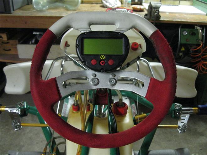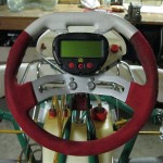 Foto 4 t/m 6: het stuur met de Alfano lap-timer. Het stuur is licht naar de rijder toe gekanteld, doordat er onder de bovenste boutjes diverse sluitringen zijn geplaatst. Deze sluitringen gaan we vervangen door een aluminium plaat (taps gefreesd). Tevens gaan we de kunststof stuurstanggeleiding aanpassen: het gat wordt groter gekotterd en er wordt een bronzen bus geplaatst.